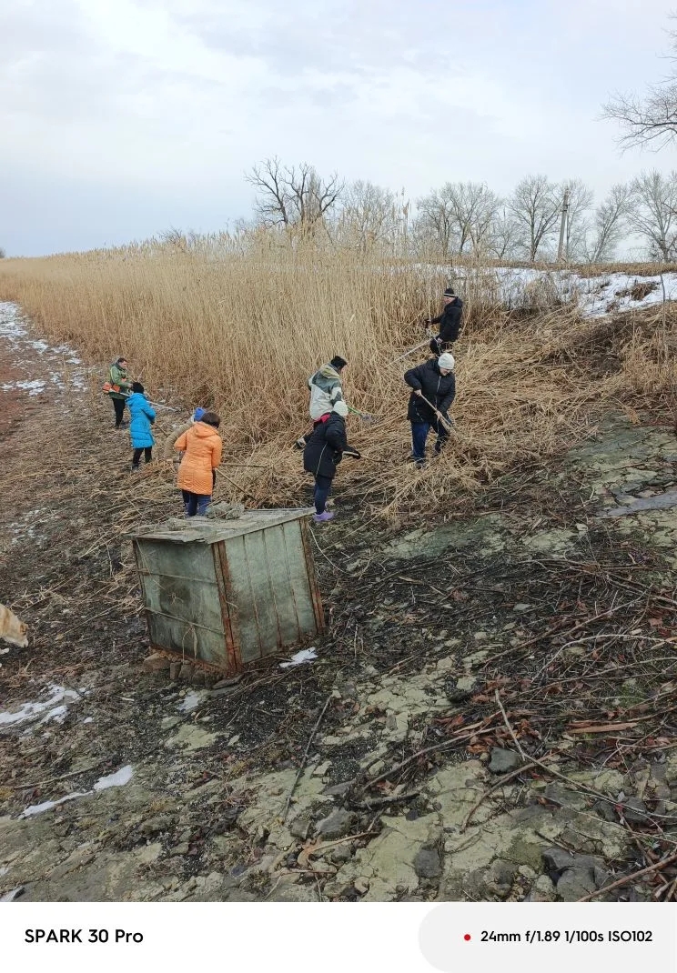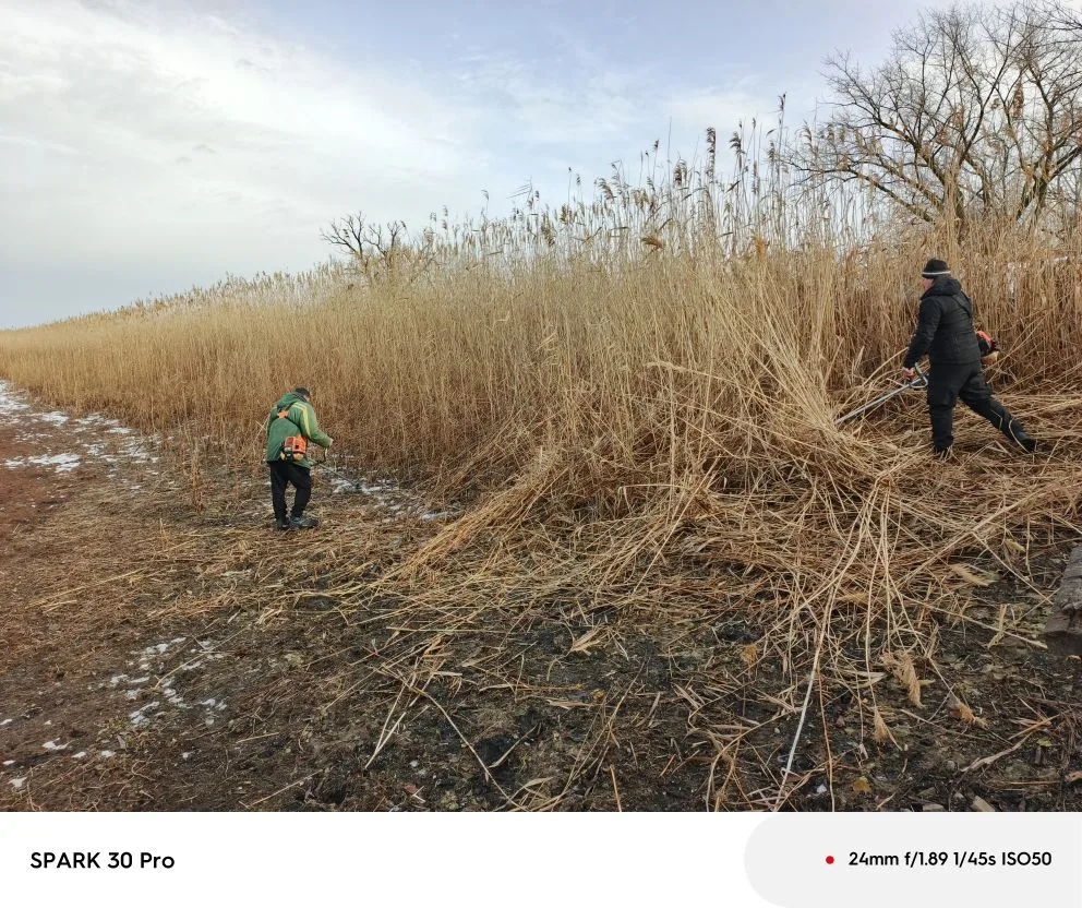 Параллельно ведутся работы на пруде-отстойнике. С помощью триммеров и граблей сотрудники расчищают откосы от сухой растительности — камыша и кустарника. Это обеспечит нормальный гидрологический режим при заполнении пруда.